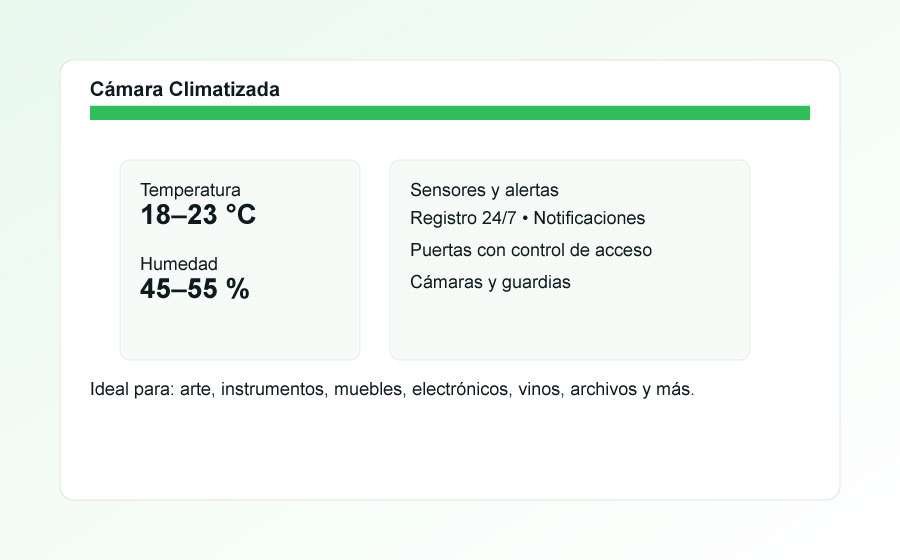 Protege muebles finos, instrumentos, arte, equipos electrónicos, vinos y documentos. Temperatura estable (18–23 °C) y humedad relativa objetivo (45–55 %) en espacios desde 2,5 m² a 20 m². Seguridad 24/7 y acceso fácil.